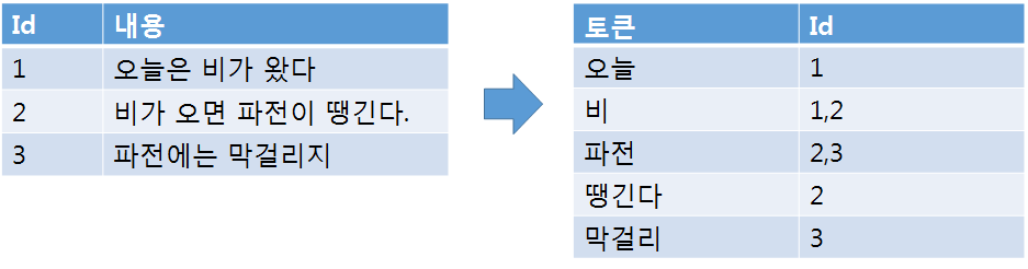 Elasticsearch 는 데이터를 저장할 때 검색에 유리하도록 데이터를 역인덱스(Inverted index) 구조로 저장하기 때문에 데이터 검색에 한해서는 기존에 RDB 보다 성능이 뛰어나다. Elasticsearch 에서는 데이터를 저장하는 과정을 색인(Indexing) 한다고 표현한다. 역인덱스 구조의 예시를 보자면 다음과 같은 문장이 있을 때 아래와 같이 분할해서 저장한다.